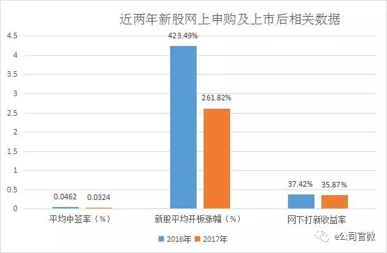 尽管2017年新股发行数量大幅提高,但网上打新收益率仍然较去年的37.42%下降至35.87%。打新收益“增量不增价”的一个重要原因在于中签率和新股开板涨幅都较去年有明显缩水。