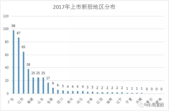 从地域分布来看,广东省共有98只,位列第一,浙江省排名第二,有87只;江苏省第三,共有65只。这三个地区合计250家,占全年新上市公司总数的57%。