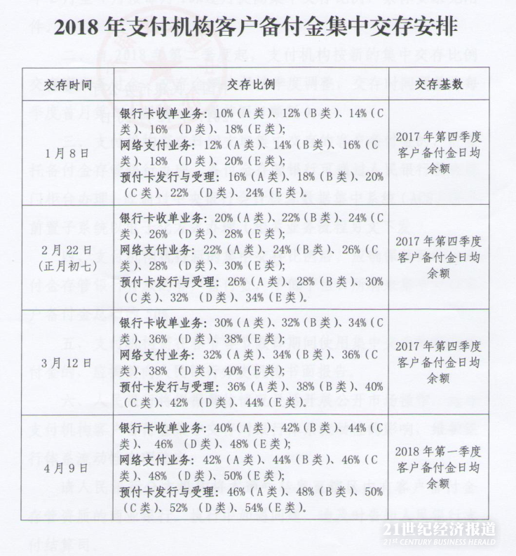 另外,自2018年第二季度起,支付机构按新的集中交存比例交存客户备付金,交存金额恢复按季度调整,交存时间调整为每季度首月第二个星期一(遇节假曰顺延)。
