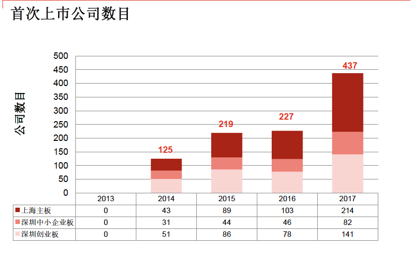 从首发数据来看,上海主板首次上市公司由2016年的103家上升至2017年的214家;深圳中小板首次上市公司由2016年46家上升至2017年的82家;深圳创业板首次上市公司由2016年78家上升至2017年的141家,新上市公司从2016年合计227家提升为2017年的437家。