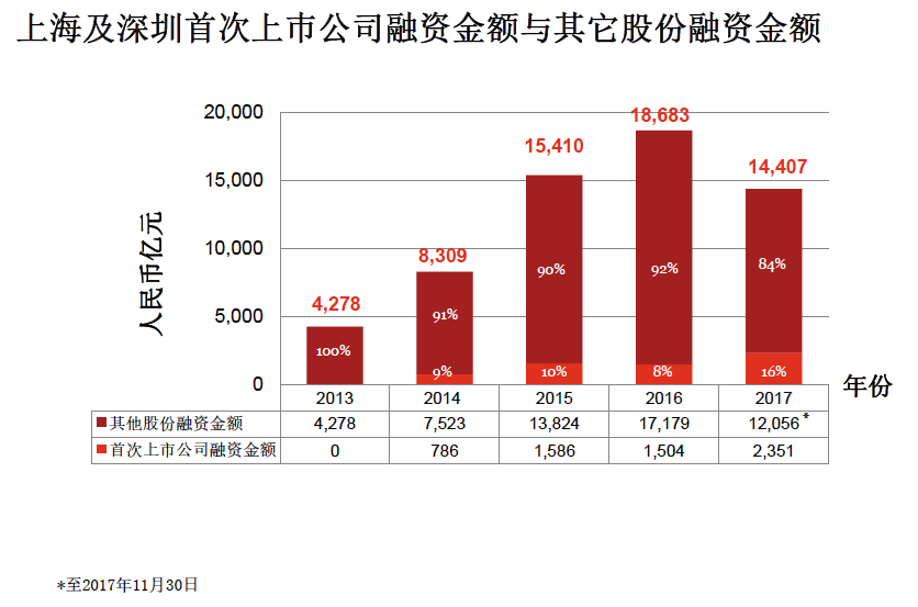 从融资渠道来看,截止2017年11月30日,2016年沪深股市IPO融资1504亿元,占当年1.86万亿元融资的8%,而2017年,沪深股市IPO融资2351亿元,占当年1.44万亿元融资的比例提高为16%。