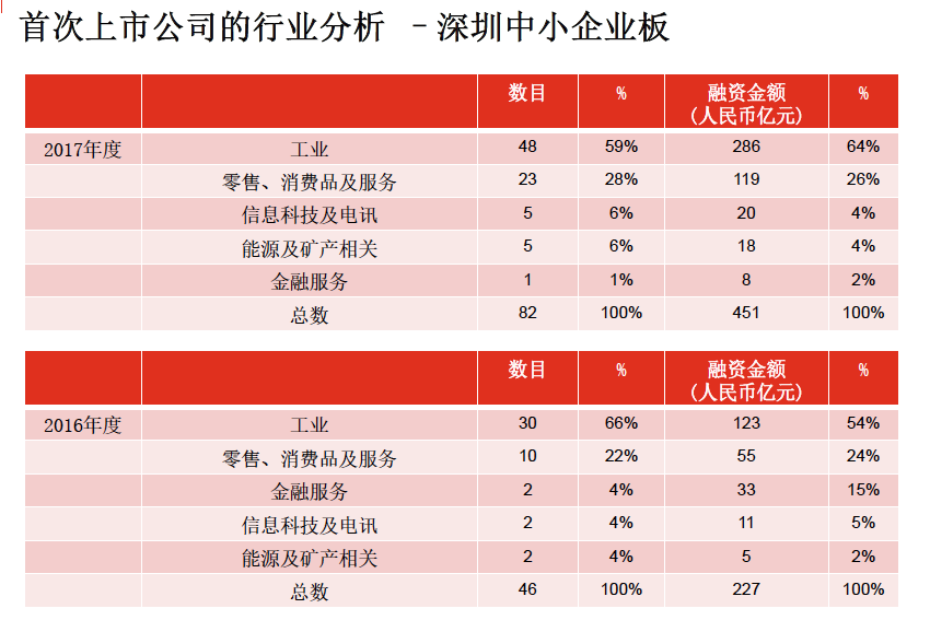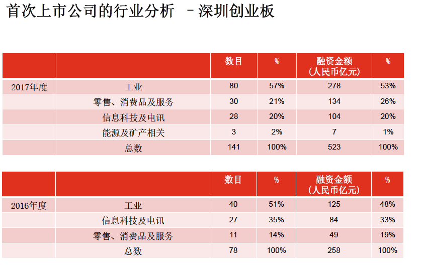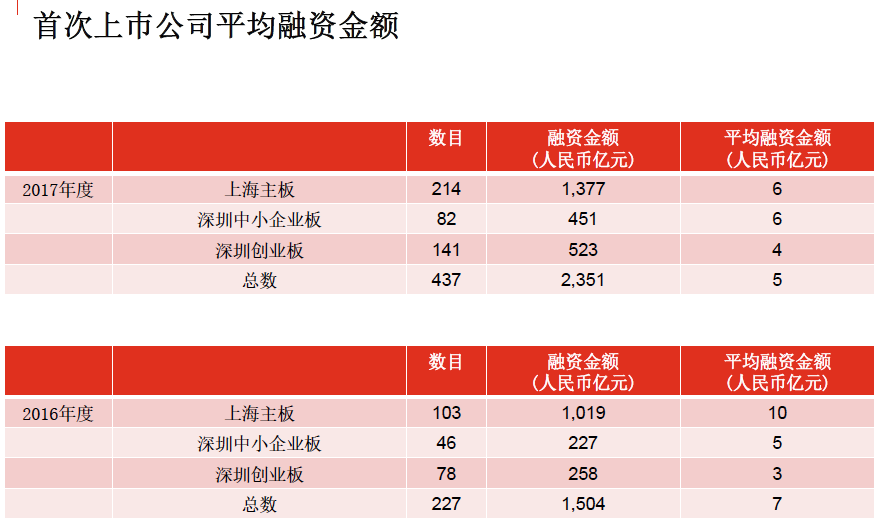 2017年,上海主板IPO共计214 宗,融资额1377 亿元;深圳中小企业板IPO共计82宗,融资金额451亿元。深圳创业板IPO共计141 宗,融资金额523亿元。