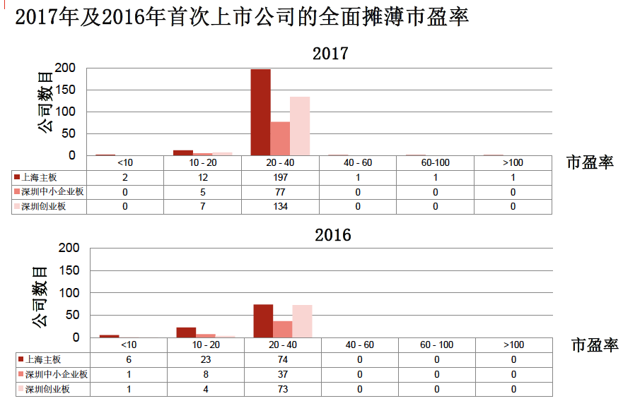 2017年沪深股市IPO企业市盈率主要集中在20-40倍,在此区间的上海主板企业为197家,深圳中小板企业为77家,创业板企业为134家,值得一提的是,上海主板市盈率在40-60倍、60-100倍以及100倍以上的企业各有1家。
