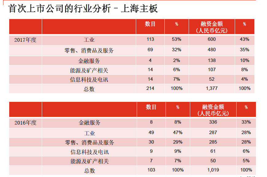 从行业来看,2017年沪深IPO企业以工业产品、消费品及服务、信息科技及电讯行业为主。