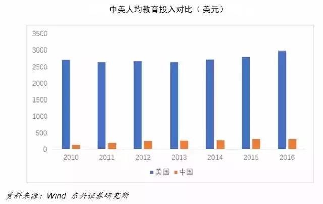 *人均教育投入:虽然2010年以后中国加大了教育投入,人均数值增长了一倍,但至2016年仍然连美国的十分之一都不到。