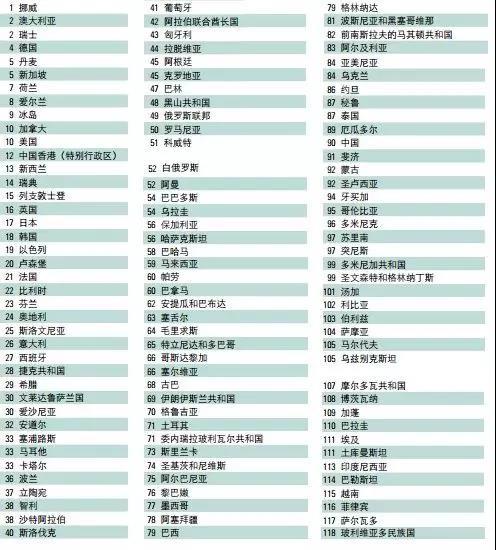 联合国开发计划署2016年人类发展指数(HDI)排名。1-51名为“极高人类发展水平”,52-106名为“高人类发展水平”,107名以后是“中等人类发展水平”和“低人类发展水平”。人类发展指数只有三个评估因素:人均GDP、人均受教育年限、人均寿命。