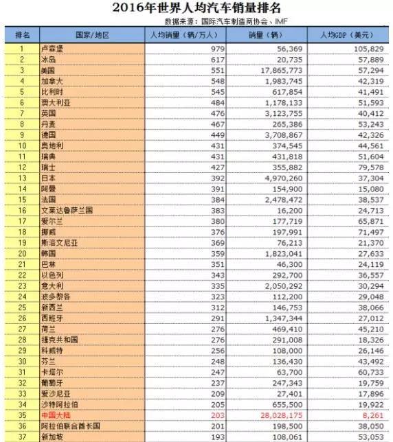 *在汽车销量上。2016年,中国大陆人均汽车销量高达每万人203辆,居世界第35名,比新加坡高,更是中国台湾111辆的近两倍,美国也仅为中国的2.5倍。