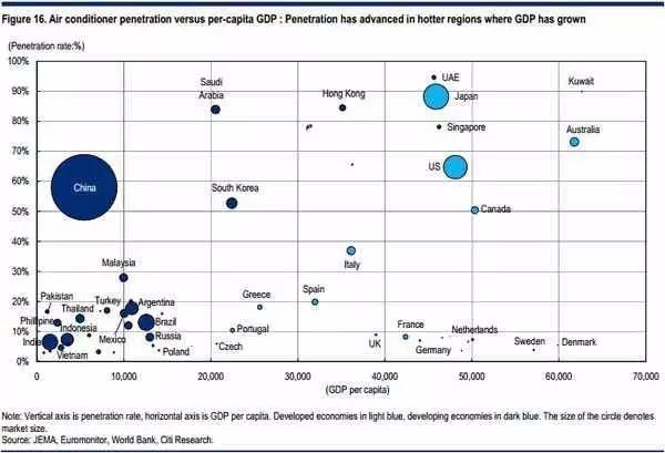 空调渗透率指标,横轴为人均GDP,圆的大小是市场规模,其高低反应空调的使用量