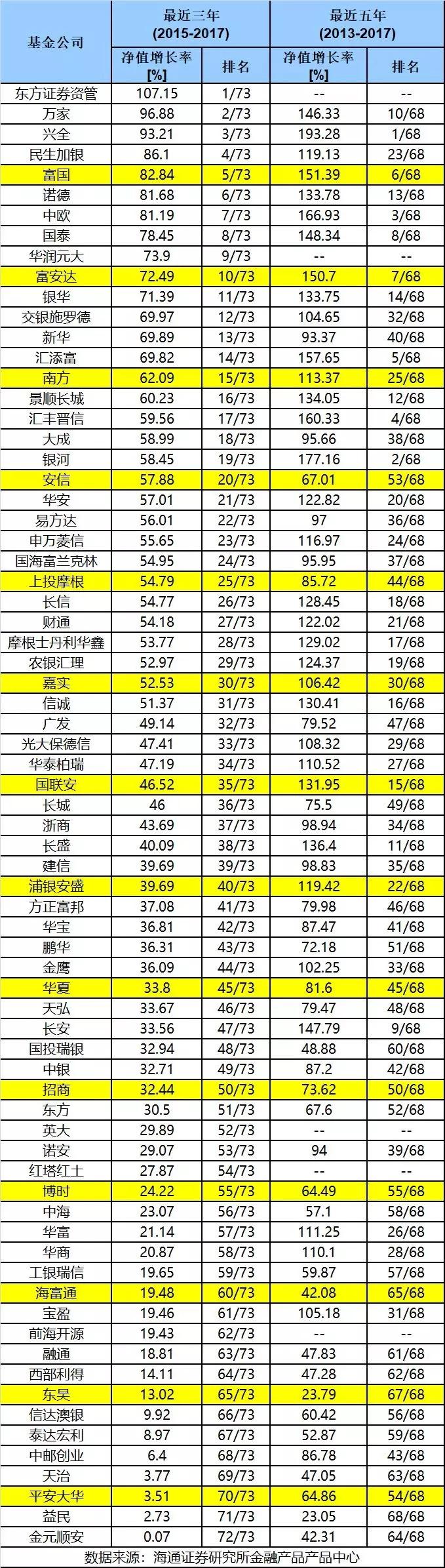 如果说2017年更多是蓝筹白马风格基金公司天下,那么,从三年期和五年期的中长期表现来看,一些实力基金却是中坚力量,基金公司也基本获得长期稳健的正回报。