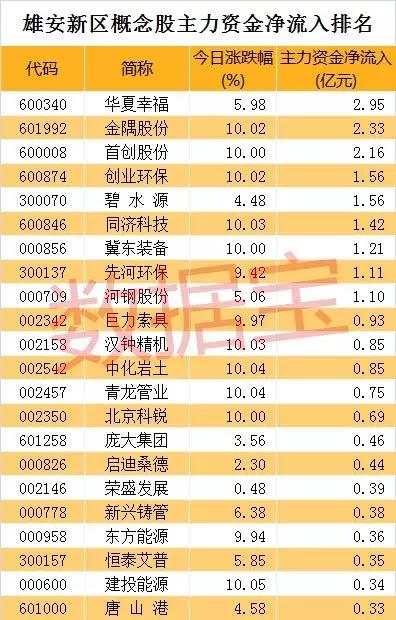 从资金流向看,今日雄安新区概念主力资金净流入合计23.97亿元,其中9只个股主力资金净流入逾亿元,曾经的雄安新区概念龙头股之一华夏幸福主力资金净流入2.95亿元居首,该股今日放量上涨5.98%。金隅股份、首创股份主力资金净流入分别为2.33亿元、2.16亿元。