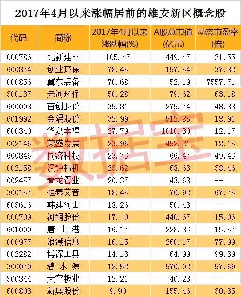 市场表现较好的雄安新区概念股中,4只个股2017年4月以来累计涨幅在50%以上,分别是北新建材、创业环保、冀东装备、先河环保。