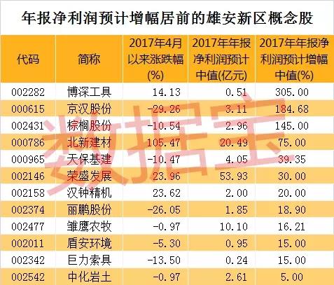 根据最新披露的2017年业绩预告数据,数据宝统计显示,15只雄安新区概念股2017年预计实现盈利,其中7只个股预计净利润增幅在20%以上,博深工具、京汉股份、棕榈股份等预计净利润增幅翻倍。