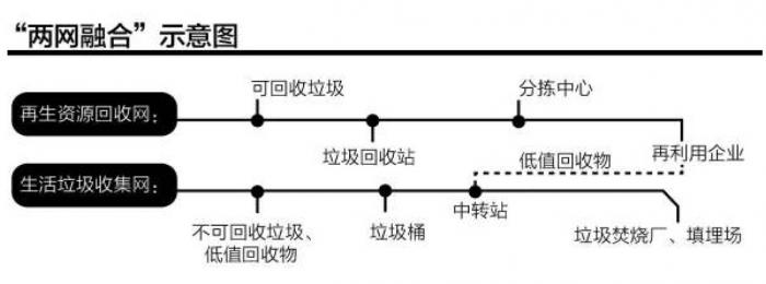 换句话说,原本孤立的城管部门的城市生活垃圾收集网和供销社系统的再生资源回收网,通过跨网协作,实现了“两网融合”。