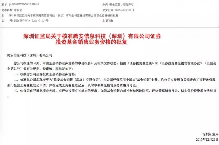 1月2日,深圳市证监局网站发布批复:核准腾安信息科技(深圳)有限公司的证券投资基金销售业务资格;核准公司名称变更为“腾安基金销售(深圳)有限公司”,在公司经营范围中增加“基金销售”业务。