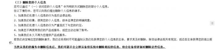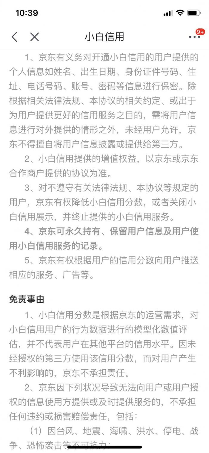 事实上,这一现象并非孤例。比如京东集团旗下小白信用的隐私政策中相关条款的表述则是:京东可永久持有、保留用户信息及用户使用小白信用服务的记录。