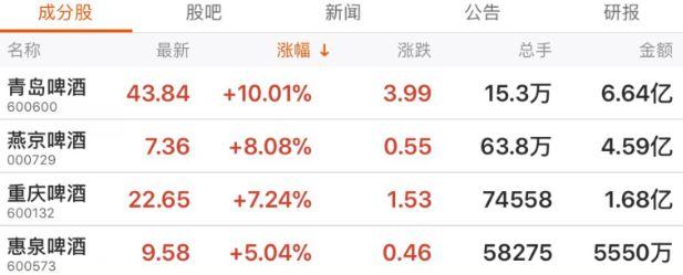 但这样的好日子似乎要结束了。继高端白酒集体涨价后,不少男人爱喝的啤酒也迎来一大波涨价潮。有媒体5日报道称,因为生产成本增加,2018年1月1日起,包括华润雪花、青岛啤酒在内的多家啤酒企业将对产品进行价格调整。“啤酒集体涨价”的消息也在资本市场上引发狂欢。截至5日午间收盘,A股市场方面,青岛啤酒涨停,报43.84元;燕京啤酒上涨8.08%;重庆啤酒上涨7.24%。港股市场方面,华润啤酒涨幅一度超过10%。