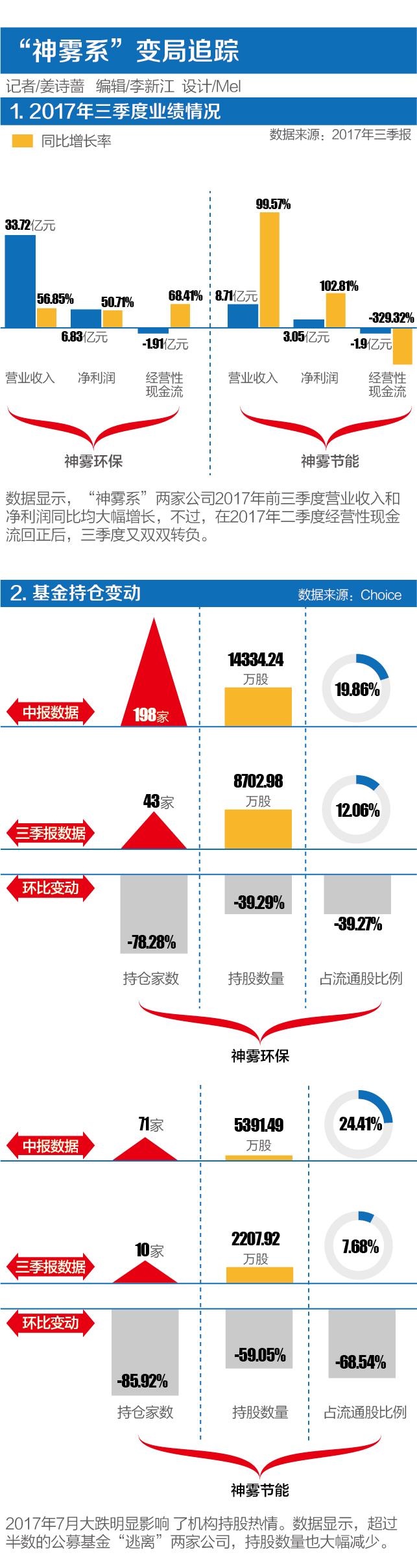当然,机构出逃亦不在少数。2017年三季度,仅剩43只基金持有神雾环保,持股占流通股比例降至12.06%;仅剩10只基金持有神雾节能,持股占流通股比例降至7.68%。
