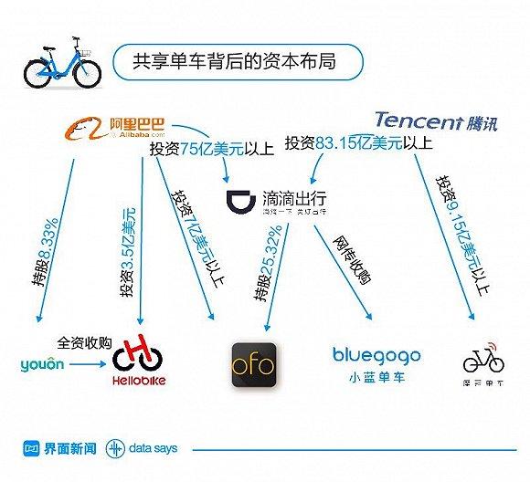 摩拜的背后是腾讯,累计投资金额在9.15亿美元以上。ofo的背后是滴滴,持股比例达25.32%。如果滴滴收购小蓝单车部分资产情况属实,那滴滴出行App将不止接入ofo一家共享单车品牌。此外,阿里系资金在2017年也开始注入ofo,与滴滴争夺ofo控制权。且阿里在共享单车方面的布局不止于此,其2017年9月领投了永安行低碳,12月参投了哈罗单车。