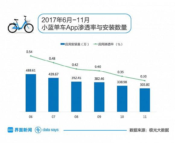 极光大数据显示,小蓝单车虽然已于2017年10月关闭,但是其App的安装量截至11月,仍有303.80万。