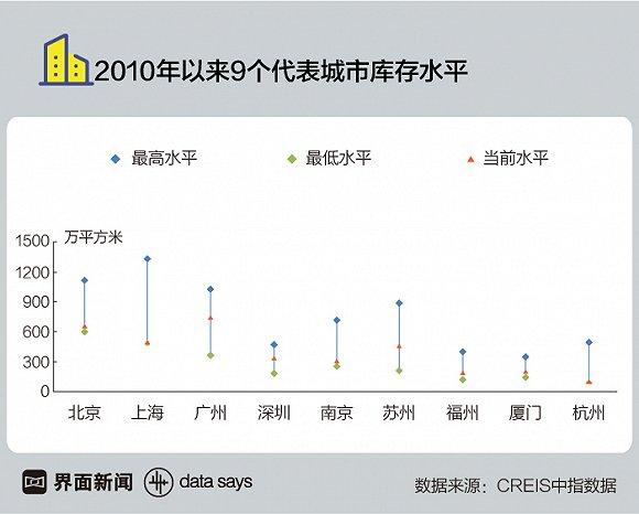 在9个代表城市中,上海和杭州目前的库存面积基本处于2010年以来的最低水平,广州、深圳和苏州目前的库存面积则明显高于其近七年的最低水平。