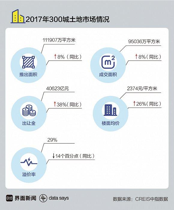在主要大中城市纷纷增加土地供应的情况下,大型房企的拿地热情也空前高涨。中指院数据显示,2017年50家百亿级代表房企招拍挂拿地金额同比增加74.4%,拿地面积同比增加81.4%,拿地楼面均价则同比减少19.1%。