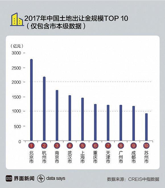 从土地出让金规模来看,一二线热点城市仍是主力军,北京和杭州在2017年的土地出让金规模超过2000亿元,分列第一、第二。南京、武汉、上海、重庆、天津、广州和成都7个城市的土地出让金规模也都在1000亿元以上。