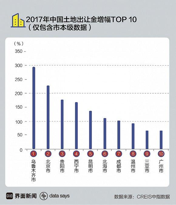 从土地出让金增幅来看,中西部城市在2017年表现突出,其中乌鲁木齐土地出让金达到291亿元,同比上涨295%。贵阳、西宁、昆明、北海和成都5个城市的土地出让金涨幅均超过100%。