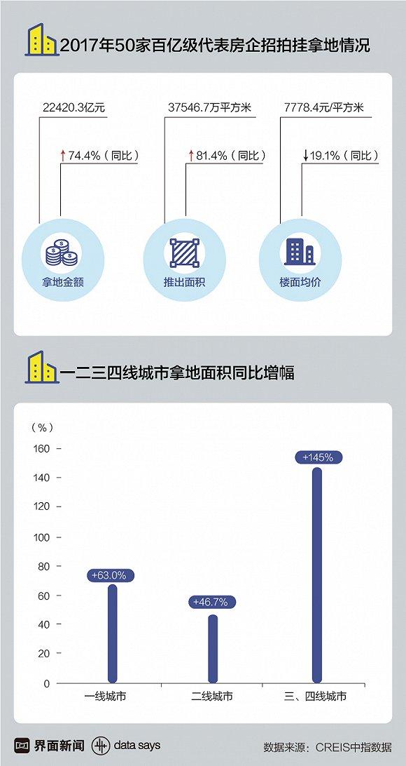 并且,大型房企的拿地重点正在向 三、四线城市下沉,2017年50家百亿级代表房企在三、四线城市的拿地面积同比增加了145%。
