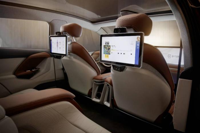 这款车最大的亮点在于,中控台配备一块长125厘米、高25厘米的共享全面屏。内饰部分还包括两块自适应显示模式的LED屏幕、五种人机交互方式、BYTON Life数字云平台、新车 B 柱上安装一套人脸识别摄像头,进一步简化车辆解锁机制。