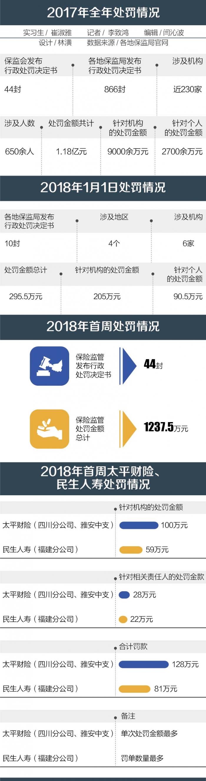 而开年首日,各地保监局合计发布10封行政处罚决定书,对北京、四川、福建、山东4个地区6家保险机构及相关负责人进行了处罚,处罚金额总计295.5万元,其中针对机构205万元,针对个人90.5万元。