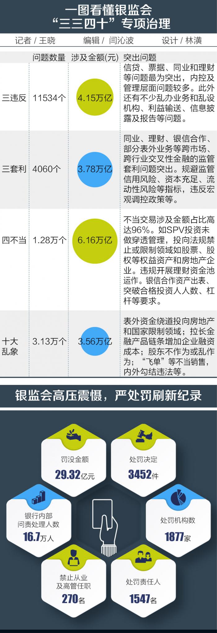 21世纪经济报道记者了解到,“三三四十”专项治理收官,各级监管机构发现问题5.97万个,涉及金额17.65万亿元。同时,银监会行政处罚金额及责任人均创下历史纪录:2017年银监系统做出行政处罚决定3452件,罚没29.32亿元,处罚责任人员1547名,270名相关责任人取消一定期限直至终身银行从业和高管任职资格。