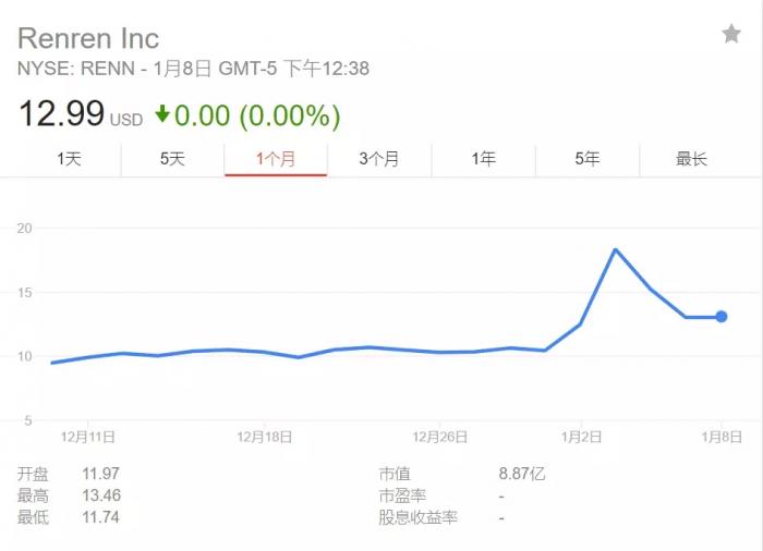 受此消息提振,1月2日人人网股价大涨19.63%,1月3日飙升47.39%,两个交易日累计涨幅达到76.32%,报收18.32美元。