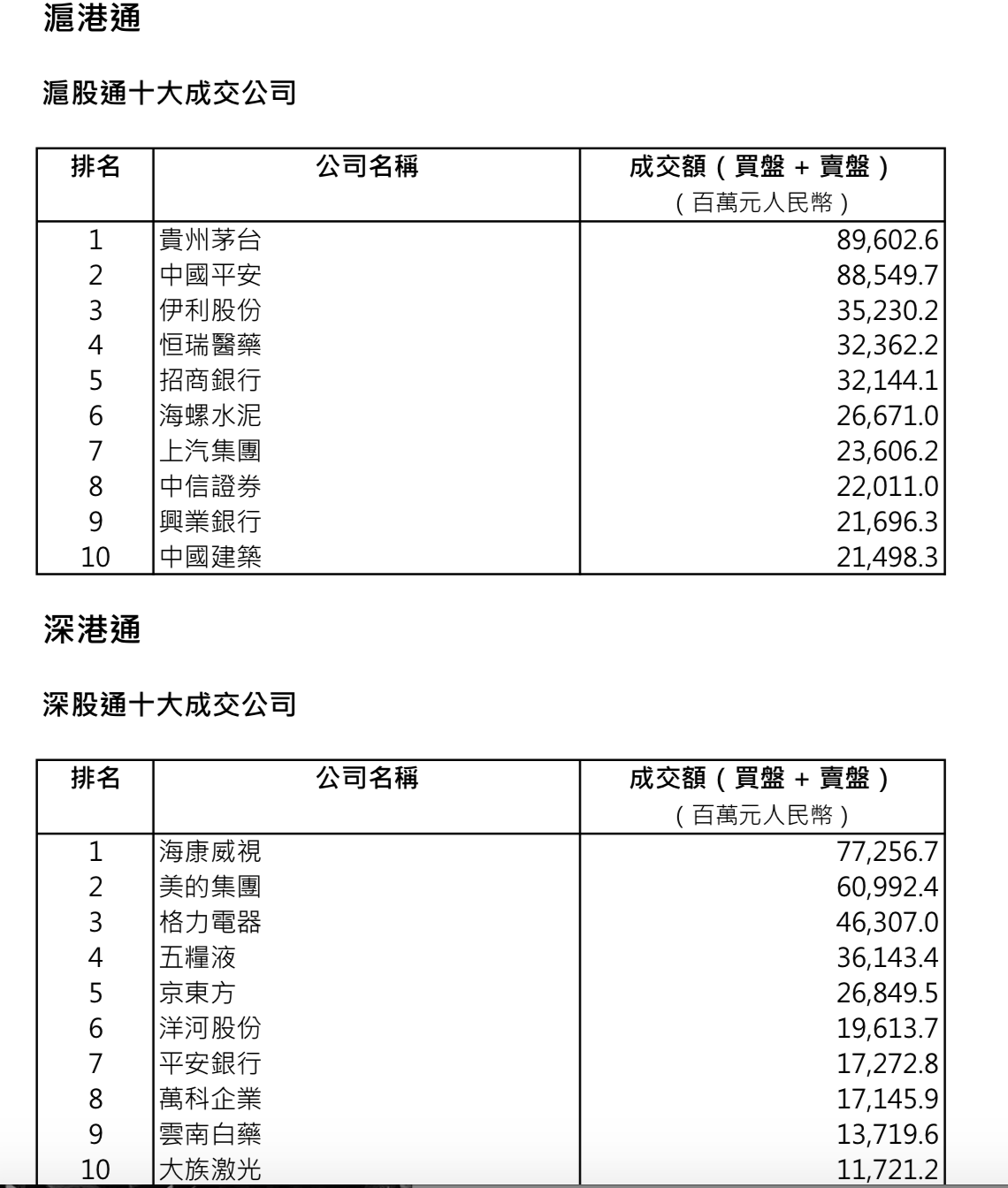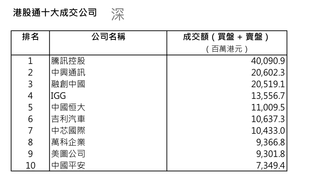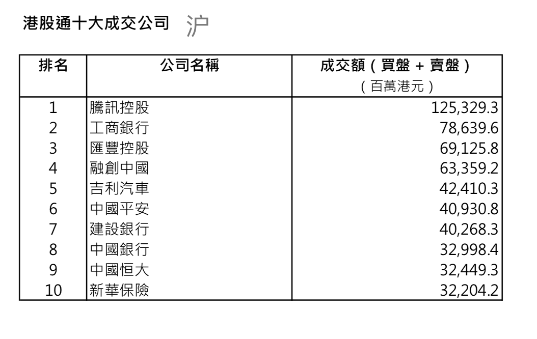 汇总沪、深港股通道后,2017年全年前三大成交分别为腾讯控股,总成交1,654亿港元;融创中国,总成交839亿港元;工商银行,总成交820亿港元。