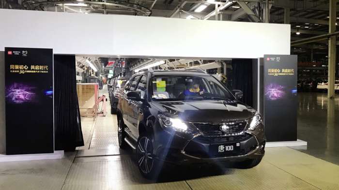 1月9日,在比亚迪深圳工厂,第30万辆新能源车——一辆比亚迪唐100驶下生产线。