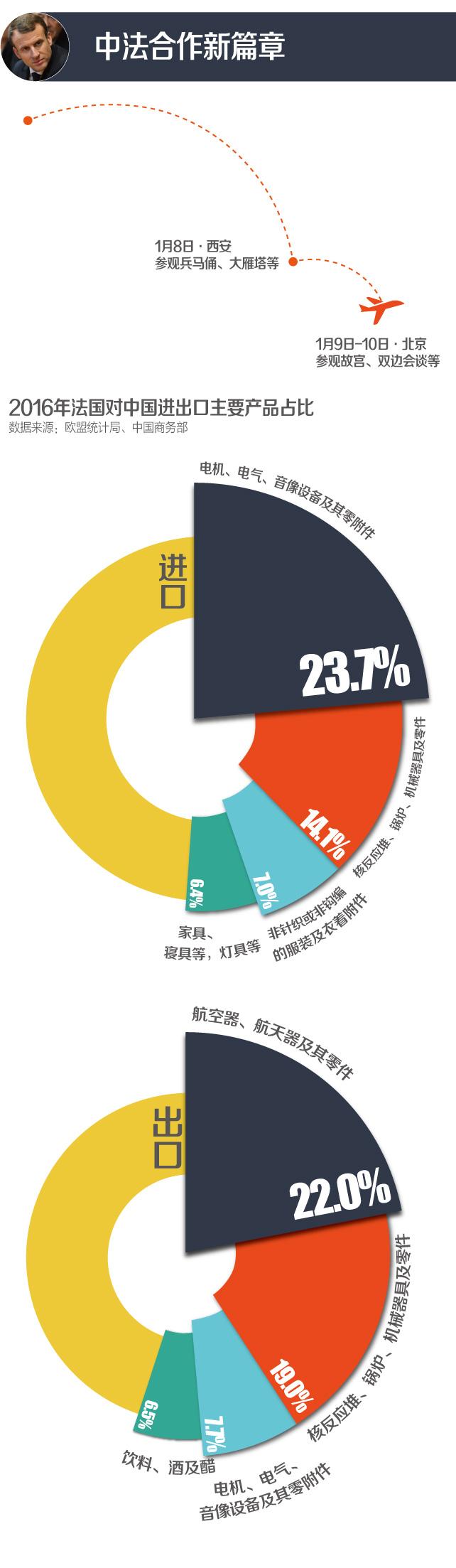 “两国的贸易关系更加不平衡,法国从中国进口450亿欧元的商品,而对华出口的商品只有150亿欧元。”马克龙说。据中国海关统计,2017年1-9月,法国对华出口153.95亿美元,同比增长22%,占法国出口总额的4%,法国自中国进口237.97亿美元,同比增长6.5%,占法国进口总额的5.2%。中国是法国第七大出口目的地和第六大进口来源地。