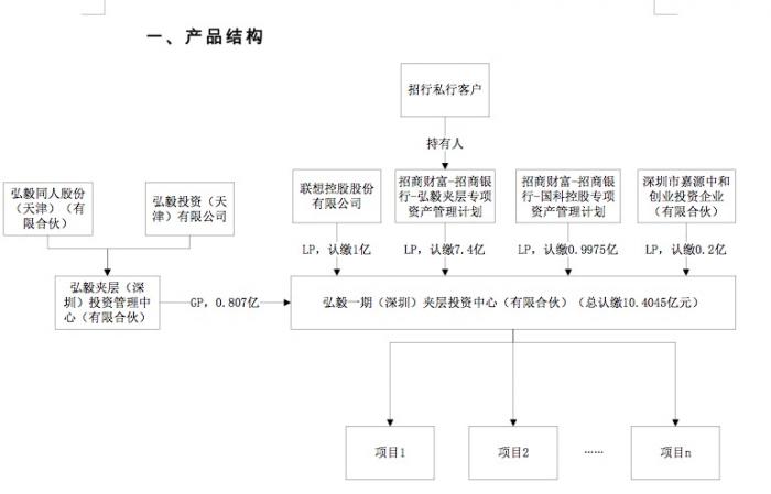 据王菁提供的产品结构图,招行通过招商财富发起的资管计划共计募集约8.4亿元,与联想控股、弘毅投资等其他机构投资者按照4:1的比例出资约2亿元,由弘毅夹层(深圳)投资管理中心(有限合伙)担任GP(普通合伙人),管理费为2%。