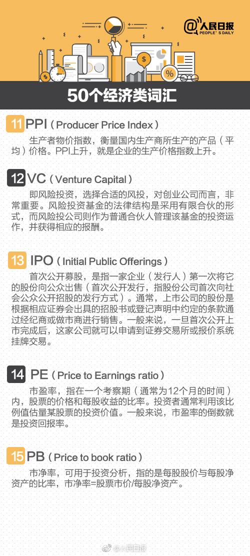 新的一年,你有理财计划吗?想进行投资,却被各种专业词汇吓住?有些名词明明经常见,却又说不出准确的概念?别急,送你50个常见经济类名词解释。VC、OTC、PMI、IPO、蓝筹股、天使投资、再贴现率…从基础知识到行情术语都有: