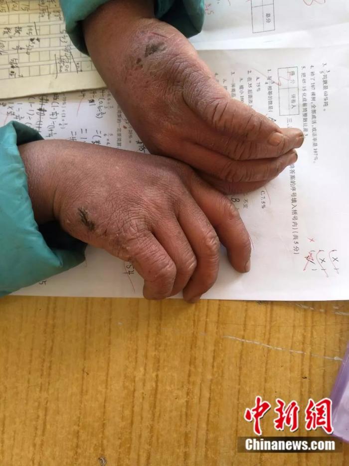 △小孩冻红的双手。转山包小学校长付恒 供图