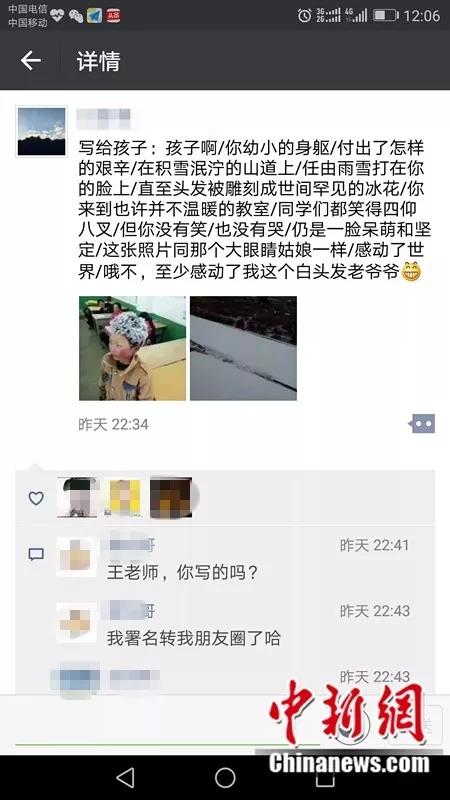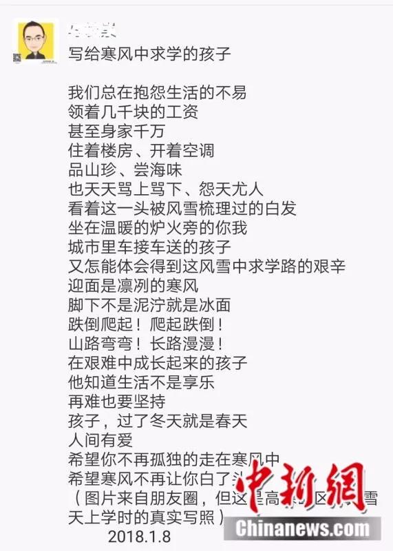 照片拍摄当日,是学校期末考试的第一天,早上气温零下几度。孩子步行一个多小时到教室后,头发就结满了冰霜。