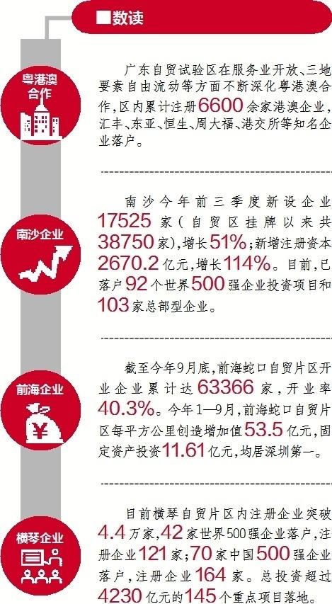 打开粤港澳大湾区地图,广州南沙、深圳前海蛇口、珠海横琴,这三大片区共同构成的广东自由贸易试验区正好占据了湾区的“黄金三角区”。