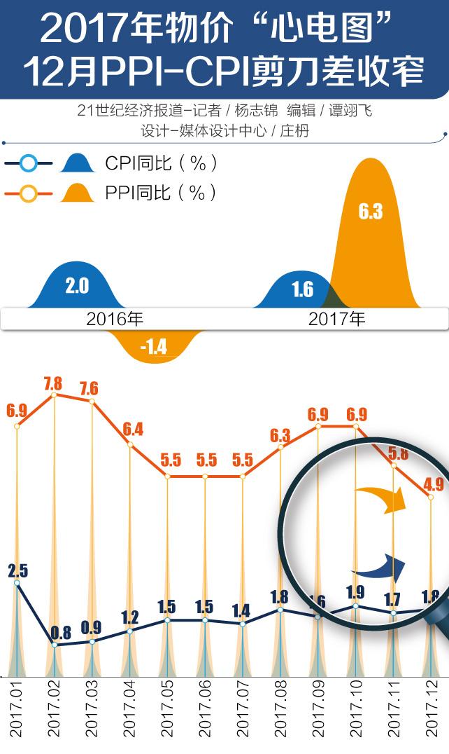 1月10日,统计局数据显示,2017年12月份CPI同比上涨1.8%,PPI同比上涨4.9%。全年CPI上涨1.6%,涨幅比上年回落了0.4个百分点;PPI上涨6.3%,结束了自2012年以来连续5年的下降态势。