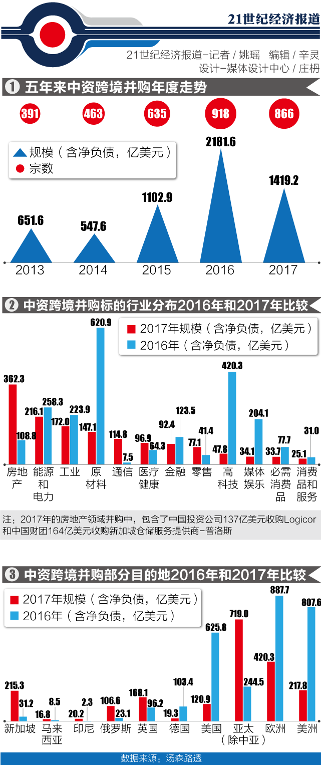 多年后回望,人们会发现,对于中资跨境并购来说,2017年是一个特殊的转折年。首先从规模看,2017上半年从前一年创历史新高的火爆,降温急冻,下半年逐步缓慢升温,全年并购金额下降了35%。从目的地看,对美并购下降8成,对欧并购下降5成,对亚洲地区尤其“一带一路”相关则升幅明显。 更关键的是,政策基调从之前的鼓励变为要求理性、真实,市场氛围也随之转变。技术、资金等需求推动下,中资跨境并购的动力仍在。而目前处于草拟阶段、下一步将出台的《境外投资法条例》,将为业界指明更多方向。 (辛灵)