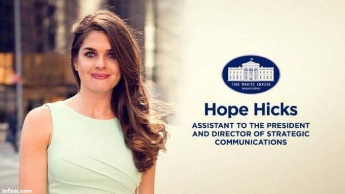 国内媒体对于伊万卡夫妇的报道很多,而白宫联络主任霍普·希克斯很少有人了解,我觉得有必要介绍一下。她是特朗普团队的元老,28岁的富二代,大学本科专业是英语文学,毕业后做过模特,然后在伊万卡的公司一边做模特一边负责公关,2014年特朗普的竞选团队一成立她就被叫去帮忙,职位是联络主任,负责的工作是安排记者采访和替特朗普发推特(有时候特朗普在推特上乱喷,特朗普团队的人不觉得应该限制特朗普在社交媒体的活动,而只是责怪希克斯没把特朗普管好)。总之好像是混合了私人秘书和保姆的工作。