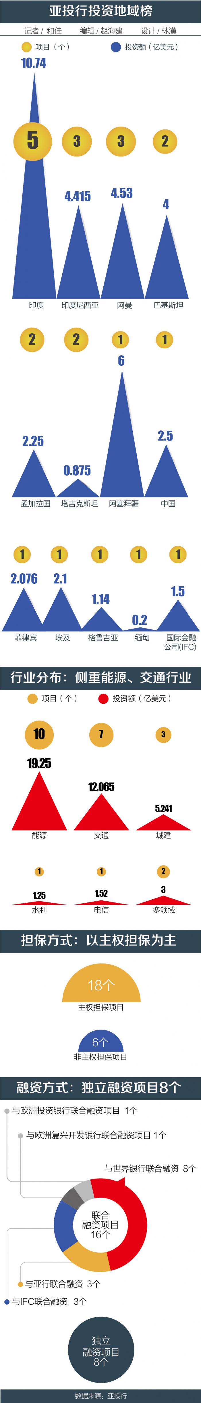 两年里,亚投行与其他多边开发银行联合融资完成了16个项目,其中8个与世界银行联合融资,3个与IFC联合融资,3个和亚行联合融资,与欧洲投资银行、欧洲复兴开发银行联合融资项目各1个。