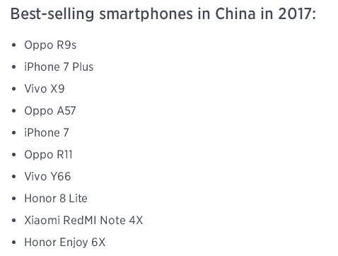 2017中国销量最佳手机TOP10:国产几乎垄断