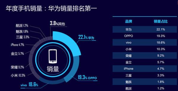 按品牌来看,华为占据着中国手机销量的榜首,来自迪信通的数据显示,2017全年中国市场手机销量中,华为、Oppo、Vivo这前三甲公司的市场份额均进一步上升: