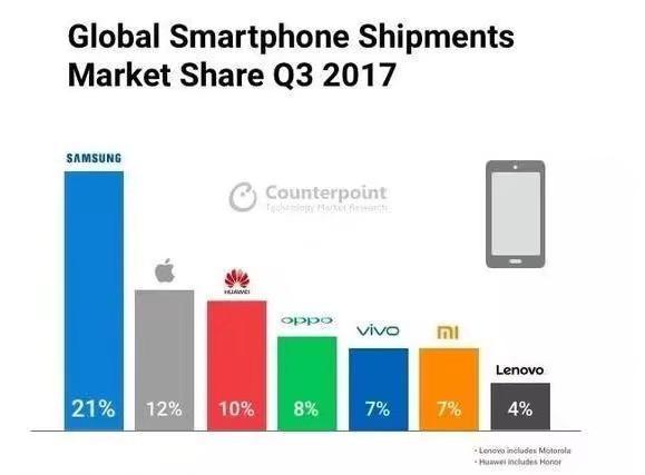 从全球出货量来看,三星所占的市场份额还是遥遥领先,以21%占据首位。苹果和华为分别占12%和10%。