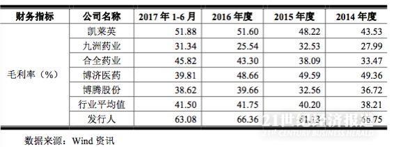 招股书显示,药石科技综合毛利率远超同行平均,且为同行最高。2014年、2015年、2016年和2017年上半年,药石科技综合毛利率分别为66.75%、61.13%、66.36%、63.08%,同行业平均值为38.21%、40.20%、41.75%、41.50%。