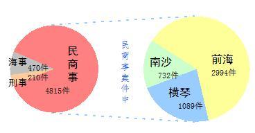 截至2017年3月31日,南沙法院(南沙片区法院)、前海法院、横琴法院共受理涉自贸区案件5025件,其中民商事案件4815件、刑事案件210件;共审结涉自贸区案件3221件,其中民商事案件3018件、刑事案件203件。(涉自贸区案件的分布情况见图三)