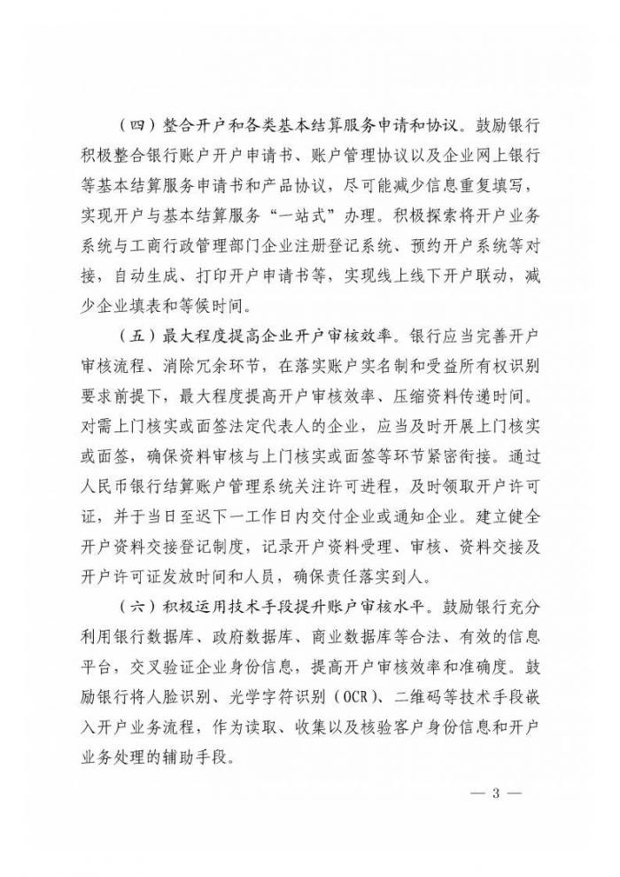 积极运用技术手段提升账户审核水平。鼓励银行充分利用银行数据库、政府数据库、商业数据库等合法、有效的信息平台,交叉验证企业身份信息,提高开户审核效率和准确度。鼓励银行将人脸识别、光学字符识别(OCR)、二维码等技术手段嵌入开户业务流程,作为读取、收集以及核验客户身份信息和开户业务处理的辅助手段。